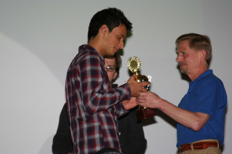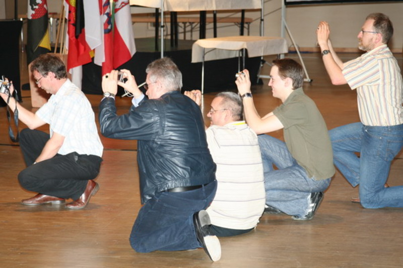 Kurze Umgruppierung auf der Bühne. Jetzt steht ein Spiel auf dem Pogramm. Auch die Schiedsrichter Daniel, Gustaf, Fritz und Matthias sollen auch die Bühne. Andrew Kesper darf dagegen die Bühne wieder verlassen. Es wird "Fotoklick" gespielt. Dabei müssen die Schiedsrichter und Spieler in zwei Teams Fotos erkennen. Jan-Christian Schröder und Chessy waren schon dabei. Es steht 1-1. Joachim Löw wird von der U10 erkannt. 2-1. Gustaf erkennt sich selbst. 2-2. Doch das letzte Photos erkennen die Spieler natürlich schneller. 3-2 gewinnen die U10-Spieler und dürfen ihre Pokale mit nach Hause nehmen.