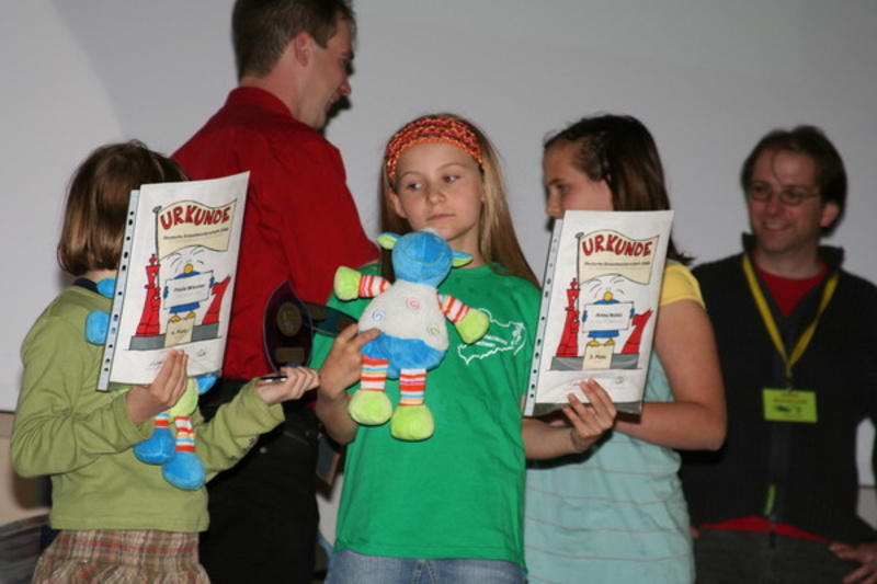 Die Moderatoren rufen zuerst die Damen auf die Bühne. Überraschungssiegerin Bo Penne aus Brandenburg bekommt tosenden Applaus. Ein tolles Bild auf dem Siegertreppchen. Es ist die Stunde der Fotografen. Jetzt dürfen die Mädels auf die Jungs warten. Denn natürlich sollen die Schachtalente ein Spiel absolvieren. Der erste Pokal ist auch schon auf den Boden geklirrt. Doch zum Glück ist nichts kaputt gegangen.