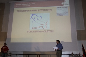 In diesem Jahr hat die Fairplay-Aktion der DEM der Landesverband Schleswig-Holstein gewonnen. Als Preis wurde in diesem Jahr kein Geld ausgeschrieben, sondern ein Freiplatz in der U10 im kommenden Jahr. Das System mit den grünen, gelben und roten Karten hatte sich etabliert. Delegationsleiter Malte Ibs nimmt den Preis entgegen.