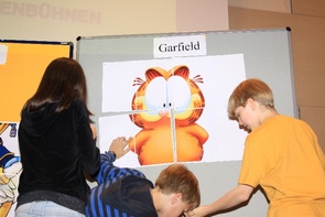 Bislang ist kaum etwas zu erkennen von der Lösung der Puzzles. Neben Garfield, Donald Duck, Minni Maus ist auch Chessy wieder aus seinen Einzelteilen zusammen zu setzen. Ist es wirklich verwunderlich, dass die U12-Spieler als erstes das Bildniss des DSJ-Maskottchens zusammen geflickt bekommen?