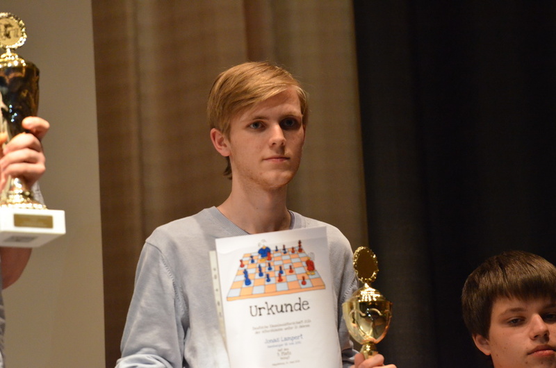 21:13: Seit wenigen Jahren undenkbar - DEM ohne GM. In diesem Jahr hatten wir sogar drei geladene Großmeister zu Gast (neben zahlreichen Großmeister-Trainern). Einer der ihren, GM Artur Jussupow, übernimmt zusammen mit Schiri Sebastian die Ehrung der U18. Auch hier gilt "Ladies first", wovon Hannah Kuckling (NRW), Isabel Steimbach (BAD), Amina Sherif (NRW), Luise Diederichs (NDS) und Premieren-Meisterin Sophia Schmalhorst (HES) profitieren.