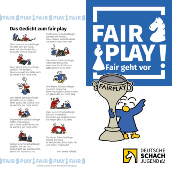 Materialien zum Thema Fair Play, wie zum Beispiel das Plakat, der Flyer, Kugelschrieber, Sticker und mehr gibt es kostenlos im chessy.shop zu bestellen.