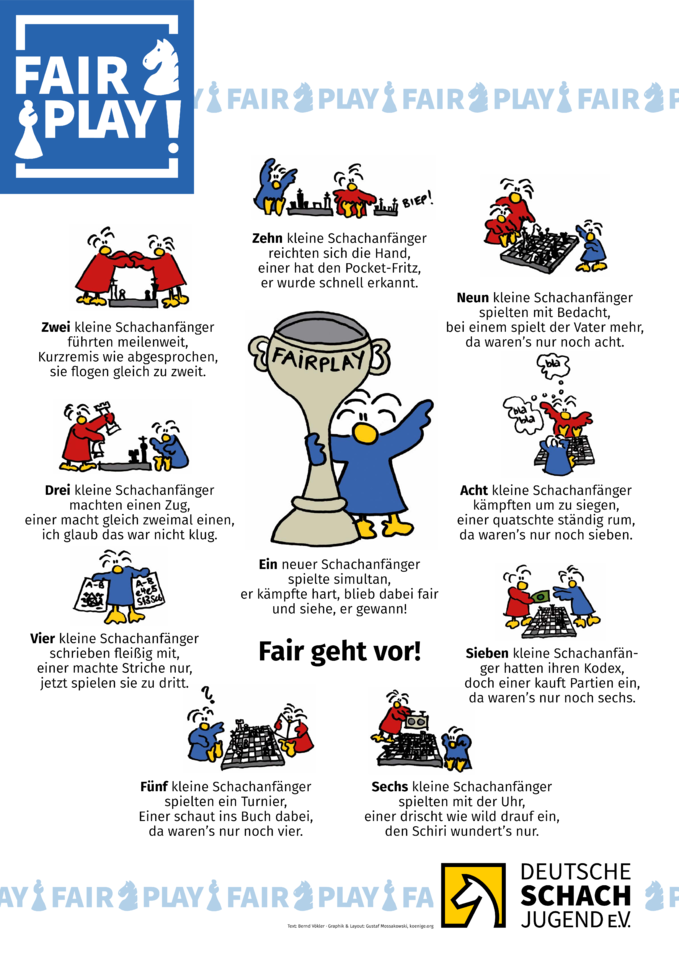 Selbstverständlich gibt es auch im Schach Fairplay, wenn es womöglich erst auf den zweiten Blick ersichtlich wird. Die FIDE-Regeln können als formelles Fairplay angesehen werden und für das informelle Fairplay hat die Deutsche Schachjugend einen Fairplay-Kodex und ein von der Jugendversammlung verabschiedetes Fairplay-Positionspapier erstellt. Damit wollen wir uns für eine positive Einstellung zum Sport, wie dem Respekt gegenüber Mitspielern, Schiedsrichtern, Gegnern sowie Fans einsetzen! Diese Attribute sind für den Sport Schach genauso wichtig wie die geltenden FIDE-Regeln.