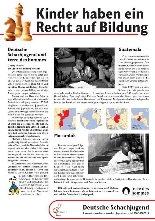 Sie drängt sich bei einem solchen Thema zwar nicht unbedingt auf, aber sie sollte auch kein Tabu sein, die Frage nach dem „Warum“. Warum unterstützt die DSJ die Arbeit von terre des hommes, denn mit Schach hat das ja nichts zu tun? Die Schachjugend - und mit ihr natürlich auch alle Engagierten in den Ländern, Bezirken und besonders den Vereinen - bemüht sich um eine sinnvolle Freizeitbeschäftigung unserer fast 30.000 Mitglieder - Kinder und Jugendliche. Kinder und Jugendliche, die sich den Luxus eines Hobbys leisten können und die sich ihre Freizeit frei gestalten können! Wir wollen terre des hommes stark machen, damit Kinder und Jugendliche überall die gleichen Rechte haben, damit jedes Kind eine Schule besuchen kann, damit Kinder überall frei über ihre Zeit verfügen und ihren Interessen nachgehen können. Unser Engagement ist - vor allem in finanzieller Hinsicht - nur ein winziger Tropfen auf den heißen Stein. Aber für die Kinder und Jugendlichen in Mosambik und Guatemala kann es die entscheidende Chance für eine bessere Zukunft sein.