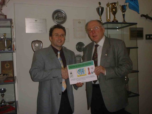 Nach dem „Tag des Schachs 2002“ überreicht DSB-Präsident Alfred Schlya den Scheck mit den Spenden an Peter Mucke, geschäftsführender Vorstand bei terre des hommes.