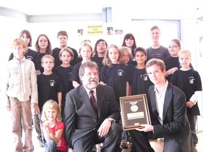Die Kinder und Jugendlichen sollten aber bei der Zertifizierungsfeier nicht nur durch Worte Beachtung finden. Sie demonstrierten Schach als Mannschaftssport, indem sie eine Blitz-Laufschachpartie zeigten. Die weißen Steine wurden von den Mädchen geführt, die schwarzen von den Jungen. Die anwesenden Gäste staunten, wie schnell die Kinder sich in die Stellung hineindenken und Entscheidungen treffen mussten. Letztendlich siegte die Jungs mit wenigen Sekunden Vorsprung auf Zeit, materiell hatten die Mädchen allerdings die Nase vorn.