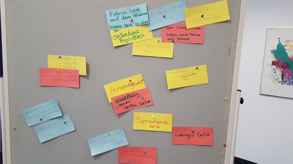 In zwei Workshops wurde den Fragen nachgegangen, wie man zum einen Frauen zum Wiedereinstieg ins Schachleben motivieren kann, die nach der Jugendzeit aufgrund anderer Verpflichtungen mit dem Schach aufgehört hatten. Eine Hamburger Initiative von vereinsungebundener Frauen - die Schachbrett-Tulpen - gab dafür bemerkenswerte Anregungen, die allerdings auch an den Grundfesten der Vereine rütteln: keine Termingebundenheit, wir suchen uns unsere Termine selbst per Doodle, die uns passen, eine gemütliche schöne Atmosphäre für den Schachtreff nicht die Kühlheit eines Vereinsspiellokales, ernst genommen werden als Gruppe, die aus Freude ohne Leistungsgedanken Schach spielen und auch lernen will, aber ohne Ehrgeiz. Die andere Fragestellung war, wie kann man junge Frauen beim Schach halten, die sich nach der Schule neu organisieren müssen, was meist mit Umzug, neuer Umgebung und neuen Bezugspersonen verbunden ist, und leider oft einhergeht mit dem Loslassen beim Schach. Wie kann man die älteren Mädchen so vernetzen, dass sie sich gegenseitig motivieren dabei zu bleiben, welche Angebote zum Beispiel an den Hochschulen muss man schaffen, um sie weiter an Schach zu binden? Eine direkte Idee der Vernetzung wurde vor Ort umgesetzt und eine Facebookgruppe geschaffen.