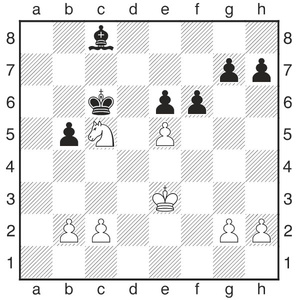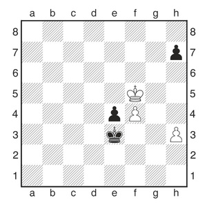 Hier sollte Cecilia 52.Kg4 spielen, was zum Remis führt. Aber was ist schlecht an 52.Kg5? Schwarz spielte 52...h6!+, was 53.Kg4 erzwang. Der zusätzliche Zug ...h6 zeigt nun seinen Wert. Nach 53...Kd4 54. f5 e3 55. f6 e2 56. f7 e1D 57. f8D Dg1+ kann der König wegen Matt nicht auf die h-Linie!
