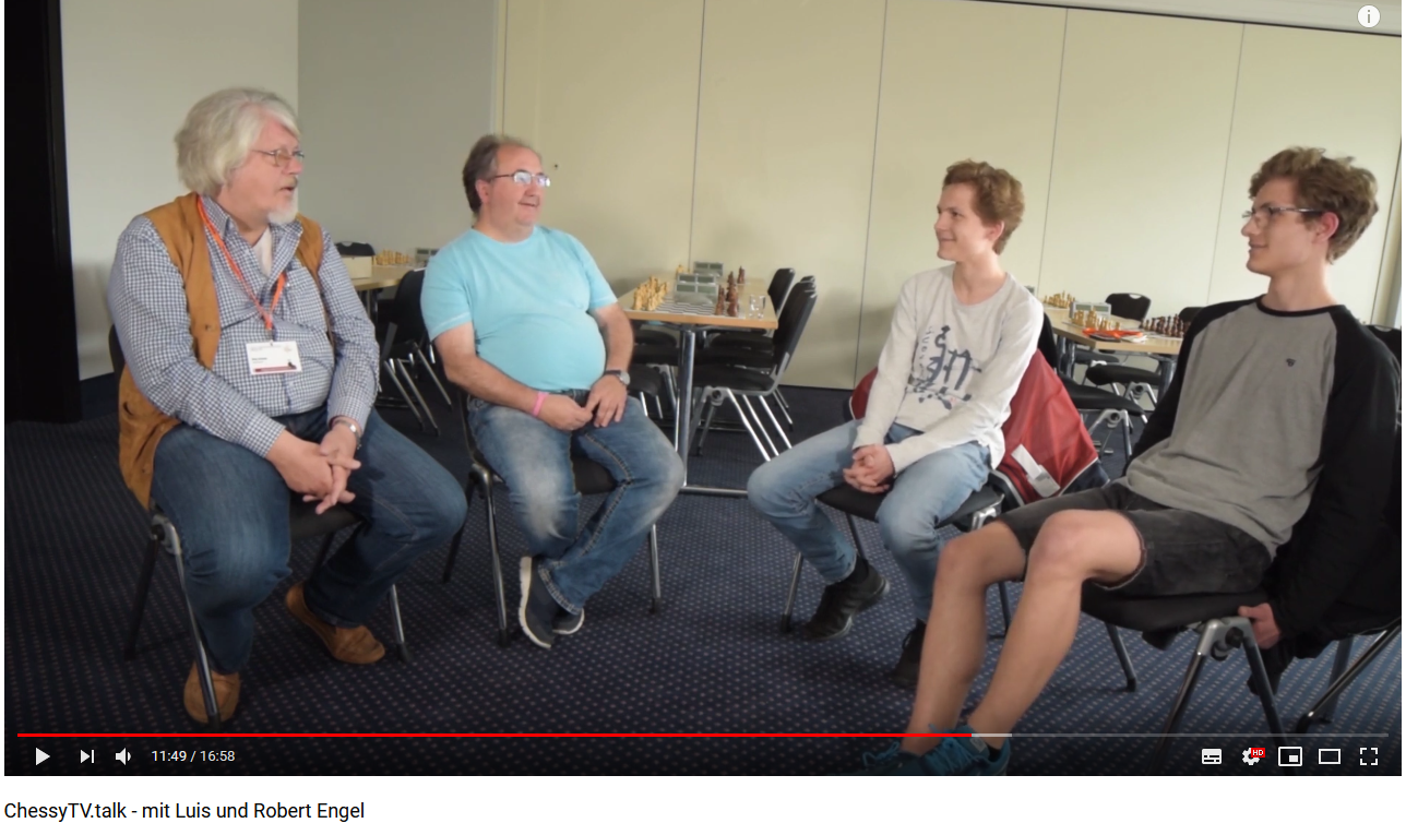 Luis Engel führt die Setzliste der DEM U18 an und dominiert im Moment auch das Feld. In diesem findet sich ebenfalls sein Zwillingsbruder Robert wieder. Im Interviewformat ChessyTV.talk sprachen die Moderatoren Jörg Schulz und Rafael Müdder mit den Hamburger Jungs über die Organisiation und Gestaltung ihres Trainings. Außerdem geht es um Fußball, denn die Brüder trainieren dreimal pro Woche und spielen in der Oberliga - hier ist, anders als im Schach, Robert der bessere. Wir erfahren weiter etwas über die Zukunftspläne der Beiden, zum Beispiel, warum Robert gerne Architektur studieren möchte und warum Luis zwar Großmeister werden, aber trotzdem nicht Schach zum Beruf machen möchte. Euch erwartet wieder ein spannendes Video, dass euch die sympathischen Engel-Brüder näher bringt. Dieses kann über YouTube angesehen werden