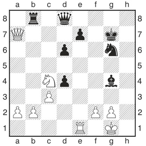Hier hätte Schwarz (Julian) mit beispielsweise 24...Ld7 seine Mehrfigur halten können. Er spielte aber 24...dxc3 und erlaubte 25.Dd4+, was Weiß wieder in die Partie ließ und am Ende zum Remis führte.