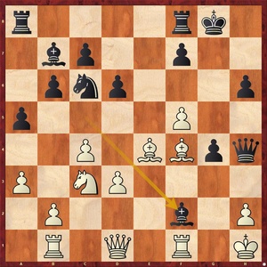 15...exf4 16.gxf4 g4 17.Le4 Das sieht naheliegend und stark aus. Der Computer findet noch eine Verbesserung, da der Partiezug Schwarz noch eine Verteidigungsmöglichkeit erlaubt.Stärker als 17.Le4 ist 17.b4! axb4 18.axb4 Ld4 (Stattdessen 18...Lxb4 19.Sd5 Lc5 20.Le4 Dc8 21.f5 gibt Weiß direkt eine Gewinnstellung.) 19.Se2 Lf6 20.b5 Sd8 21.Lxb7 Sxb7 22.Sg3 Der weiße Springer greift entscheidend ein. 22...Dd7 23.Sh5 Df5 24.Dxg4+ Dxg4 25.Sxf6+ Kg7 26.Sxg4 und Weiß hat eine Mehrfigur.]