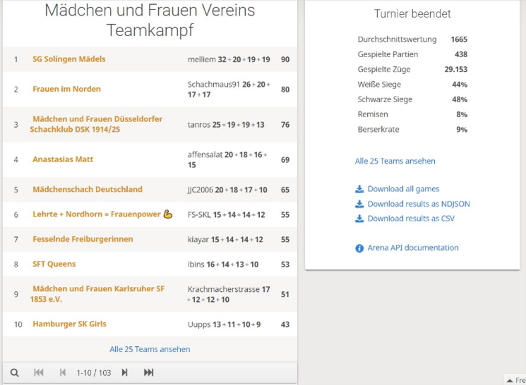 Am Samstagnachmittag konnten die Spielerinnen bei dem Mädchen und Frauen Vereinsturnier ihr Können unter Beweis stellen. Dabei nahmen 25 Teams teil und versuchten den Titel zu gewinnen. Dies gelang mit 90 Punkten dem Team „SG Solingen Mädels“. Einen zweiten und dritten Platz konnten die „Frauen im Norden“ mit 80 Punkten und „Mädchen und Frauen Düsseldorfer Schachklub DSK 1914/25“ mit 76 Punkten ergattern.