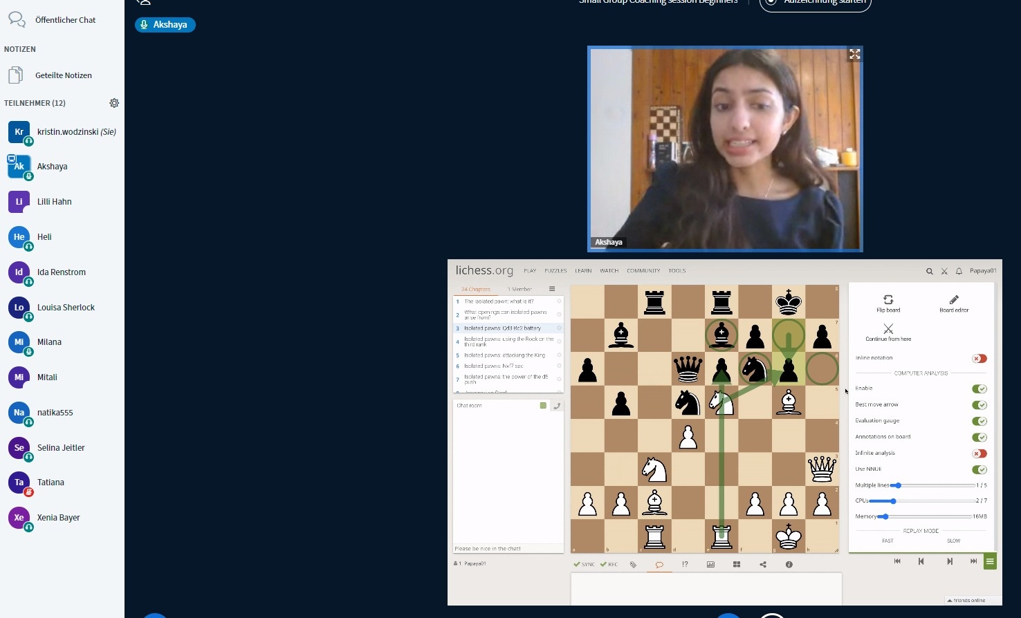 Am Vormittag gab es drei Trainingssessions mit WFM Anna Endress, GM Marie Sebag sowie WIM Lara Janzelj und WIM Teja Vidic auf Twitch. Parallel dazu gab es auch deutschsprachiges Training mit WGM Tatiana Melamed und WCM Luisa Bashylina.