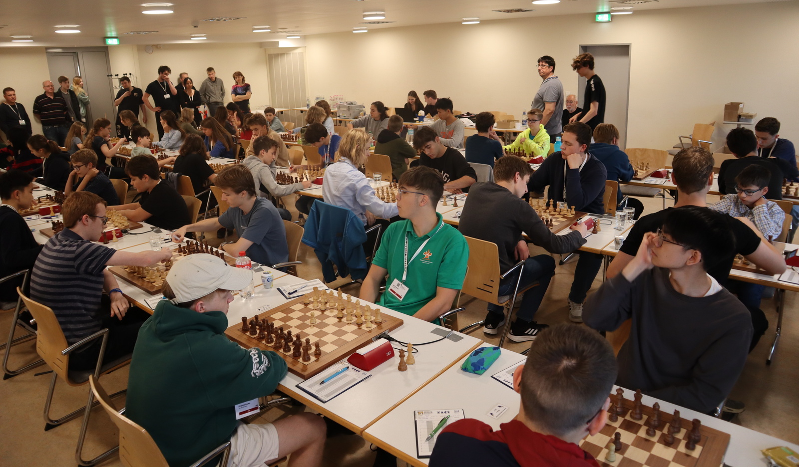 Nachdem der gestrige Tag mit seinen vielen Freizeitangeboten eine Verschnaufpause für alle Teilnehmenden bot, ist heute eine Doppelrunde angesetzt. Die erste Runde des Tages endet direkt mit einem Paukenschlag. Die bisher unbesiegten NRWler verlieren erstmals im Turnier gegen Hessen mit 5 : 3 und sind jetzt punktgleich mit Sachsen und Niedersachsen. Hessen kann sich mit 7 Punkten kurzzeitig über die Führung freuen, doch schon in der nächsten Runde wendet sich das Blatt wieder. Hessen verliert knapp gegen Sachsen, bleibt also auf 7 Punkten hocken und Sachsen zieht zusammen mit NRW wieder an ihnen vorbei. Ein Tisch weiter sieht ein Adlerauge einen ungedeckten Randbauern auf h3 und schlägt zu! Ungedeckt!? So einen Fauxpas lässt Lisa Sickmann natürlich nicht durchgehen. Sie schlägt die hängende Dame und gewinnt mit Schleswig-Holstein 6:2 gegen Thüringen. Damit dürfen sie morgen am ersten Tisch gegen Sachsen antreten. Hamburg wurde an den zweiten Tisch hoch gespült und darf sein Glück gegen NRW probieren.