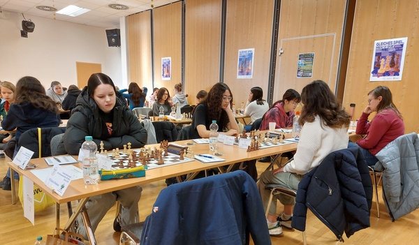 Die merkliche Müdigkeit sollte am Nachmittag spürbar sein. Am Vormittag wurde zwar ein Remis vor dem 20 Zug vereinbart, bis die Schiedsrichter, die im Gehen begriffenen Spielerinnen aufhielten und die Partie fortsetzen ließen, aber am Nachmittag stieg die Quote der Remis, zumindest in der Wahrnehmung. Nur ein Mannschaftskampf sollte ohne Remis auskommen. Wahrscheinlich waren die vorherigen Runden und ein umfangreiches Bügelperlen-Gestaltungs-Programm am Morgen kräftezehrend. Als alle ihre Bretter gefunden hatten, sollte es aber wie gewohnt pünktlich losgehen. Zu bemerken ist die außerordentliche Pünktlichkeit. Noch keine einzige Strafe, wegen Zuspätkommens, musste ausgesprochen werden und auch die Zahl der irregulären Züge ist stark zurückgegangen. Schachlich sollte es in der Spitze darum gehen, ob die SF München ihren Vorsprung behaupten und ob es bei Straucheln eben jener einen starken Verfolger gibt. Ob der Wolf im Schafspelz, auch Garching, auch den SF München zum Verhängnis werden sollte? Mit gleich zwei Alapin-Partien war der Top-Kampf, mit einer selten gesehenen Eröffnung im Jugend- und Kinderschach, vielleicht schon ein Vorgeschmack, auf das Titelrennen in der zweiten Turnierhälfte. Während die an den beiden hinteren Brettern und am ersten Brett je die schwarze Seite gewinnen konnte, durchbrach das zweite Brett dieses Muster, was den SF München einen komfortablen Vorsprung von nun zwei ganzen Mannschaftspunkten bescheren sollte. In der Verfolgergruppe konnten mit insgesamt sechs Punkten die TSG Oberschöneweide bleiben und die SAV Torgelow-Drögeheide aufschließen. Die Pole-Position gehört sicher den Münchnern, aber nicht nur in der Formel 1 gibt es unerwartete Unfälle oder rasante Verfolgungsjagden. Mit 100% haben noch fünf Spielerinnen eine weiße Weste: Jasmin Shuya Huang (SV Empor Erfurt), Madhushri Raghavan (SF München), Emma Didas (SF Birkenfeld), Leni Zietz (SAV Torgelow-Drögenheide), Emily Kotliarova (SK Bad Homburg). Wird jemandem das Kunststück mit 100% am Ende des Turniers gelingen? Wir werden es sehen! Um 8:30 Uhr geht es weiter.