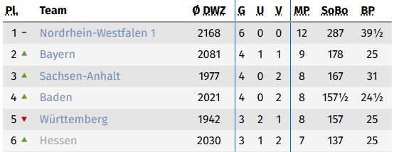 Im hinteren Teil des Tableaus konnten Schleswig-Holstein und NRW 2 mit Siegen gegen Sachsen bzw. Hamburg 1 noch einen Sprung nach vorne machen, während Berlin (gegen das Saarland) und Stichts-Gooise (gegen Thüringen) standesgemäß gewannen. Dank eines 4-4 gegen MVP schaffte es Hamburg 2 zudem noch, die rote Laterne loszuwerden.