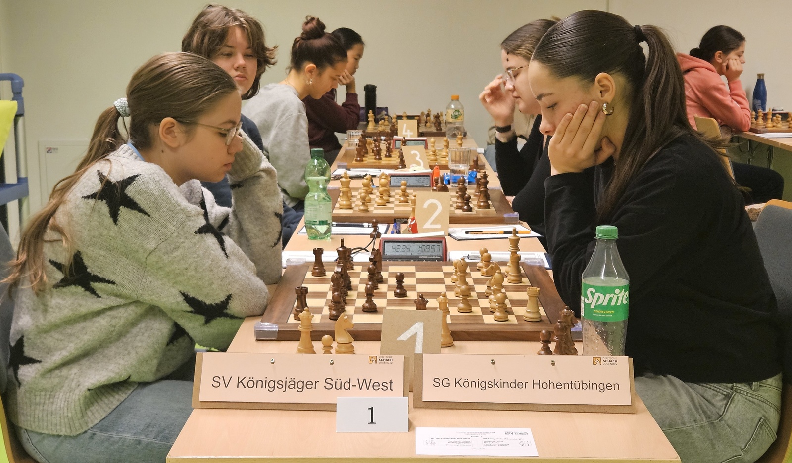 Es war ein Match, bei dem man die Spannung in Spielsaal förmlich spüren konnte. Am ersten Brett hatte beide Spielerinnen ihre Chancen auf den Sieg, doch schließlich endete die Partie Remis. Am zweiten Brett standen die Chancen lange sehr gut für Hohentübingen, doch auch hier gelang der finale Schlag nicht, noch ein Unentschieden. Am dritten Brett gelang es Linnea John einen frühen Fehler ihrer Gegnerin auszunutzen. Es folgten hier noch lange und erbitterte Kämpfe mit vielen Versuchen ihrer Gegnerin, um das Blatt noch zu wenden. Doch die Königsjägerin ließ sich ihren verdienten Punkt nicht nehmen. Am 4. Brett profitierte Tatiana Moldovan von einem gewagten Versuch ihrer Gegnerin. Da dieser nicht aufging, konnte sie hier den vollen Punkt für Hohentübingen einstreichen. Das Mannschaftsergebnis 2:2 und die Spannung im Turnier noch maximal.