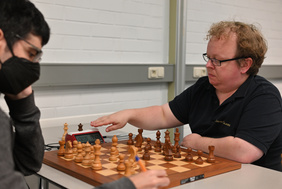Unsere internationalen Meister zeigen sich äußerst widerstandsfähig. So konnten in der Vormittagsrunde sowohl Jonathan Carlstedt gegen Oliver Stork, als auch Floryan Eugene gegen Marian Can Nothnagel gewinnen. In zuletzt genannter Begegnung knetete Floryan ganz gehörig, nämlich bis zum 115. Zug.