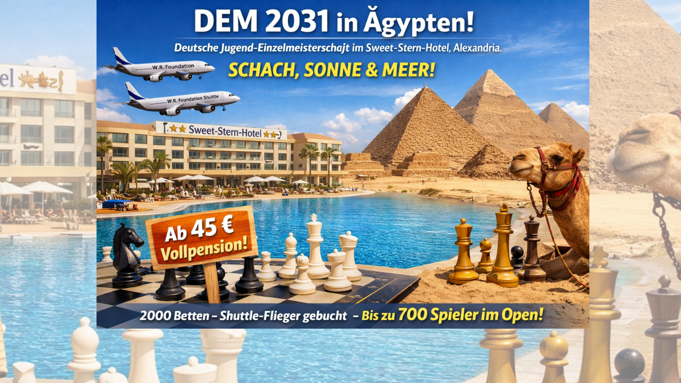 Die Deutschen Jugend-Einzelmeisterschaften (DEM) gehen im Jubiläumsjahr 2031 neue Wege: Anlässlich des 10-jährigen Bestehens der Deutschen Schachjugend e.V. wird die DEM erstmals außerhalb Deutschlands ausgetragen. Austragungsort ist das renommierte Sweet-Star-Hotel (SSH) im ägyptischen Alexandria.
