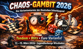Beim Chaos-Gambit 2026 wird Schach schnell, kreativ und richtig abwechslungsreich. Die Deutsche Schachjugend lädt zur Premiere eines neuen Variantenturniers ein, bei dem Teamplay, Tempo und Spaß im Mittelpunkt stehen. Vom 13. bis 15. März 2026 wird in der Jugendherberge Wiesbaden um den Titel „Chaos-Gambit Champion 2026“ gespielt.