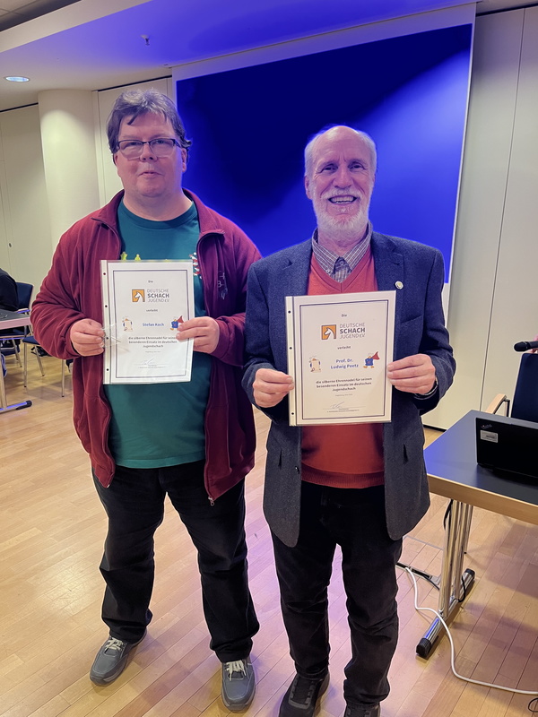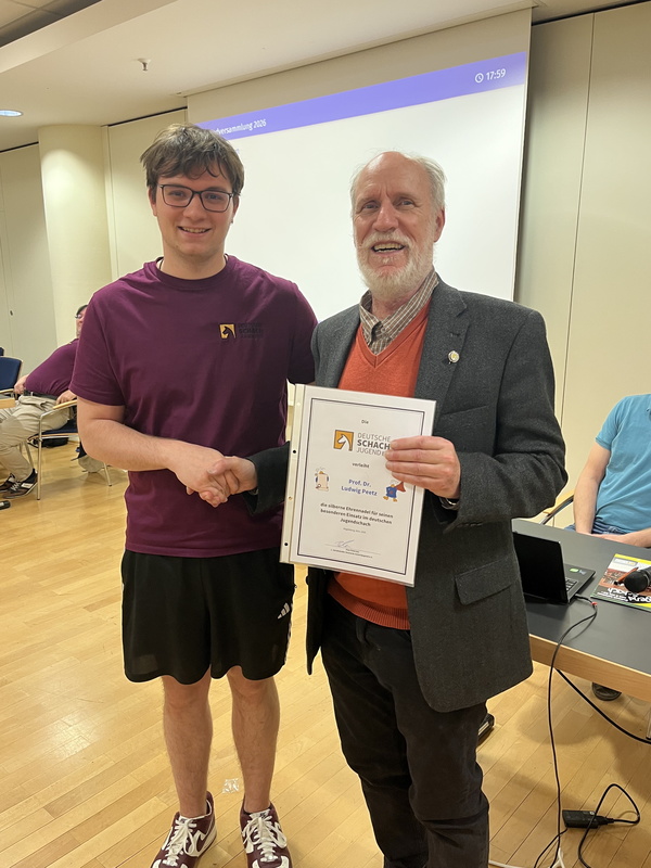 Im Anschluss wurden die silbernen Ehrennadeln verliehen. Ludwig Peetz aus Rheinland-Pfalz wurde für sein Engagement insbesondere als U8 Scout, bei RKSTs sowie im Schulschach ausgezeichnet, wo er hohe Maßstäbe gesetzt hat. Die Laudatio hielt Maurice.